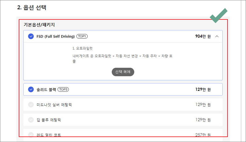 ▼ 이번에는 옵션을 선택할 차례입니다. 테슬라 차량을 이용하는 경우 FSD(Full Self Driving)은 필수라고 생각됩니다. 옵션 금액이 높은 편이지만, 그만큼 가치가 있다고 생각됩니다. 그 외에 원하는 옵션을 모두 선택해 주시길 바랍니다.