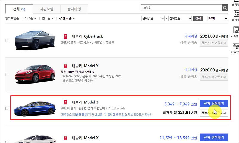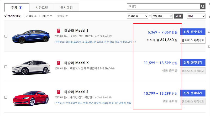 ▼ 인기 순으로 테슬라 전기차 모델을 나열해 보았습니다. 아무래도 가장 최근에 나온 모델3의 인기가 높습니다. 가격도 5천에서 7천만원 사이로 타 모델에 비해 저렴한 편입니다. 판매 금액이 범위로 나온 것은 세부 등급이나 옵션에 따라 같은 모델이라도 가격이 달라지기 때문입니다. 정확히 알고 싶으면 몇 가지 조건을 선택하면 됩니다.