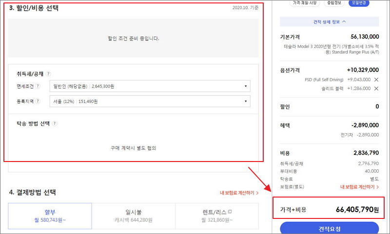 ▼ 이번에는 할인 조건과 취득세, 공채, 탁송 관련 내용을 입력할 차례 입니다. 할인과 탁송의 경우 전기차 구매 계약시 별로도 협의해야 하는 사항이라 조건 지정이 어렵습니다. 우측 하단에 보면 최종 가격을 확인할 수 있습니다. 할인조건과 탁송 부분을 제외하면 실제 구매 금액과 비슷할 겁니다.