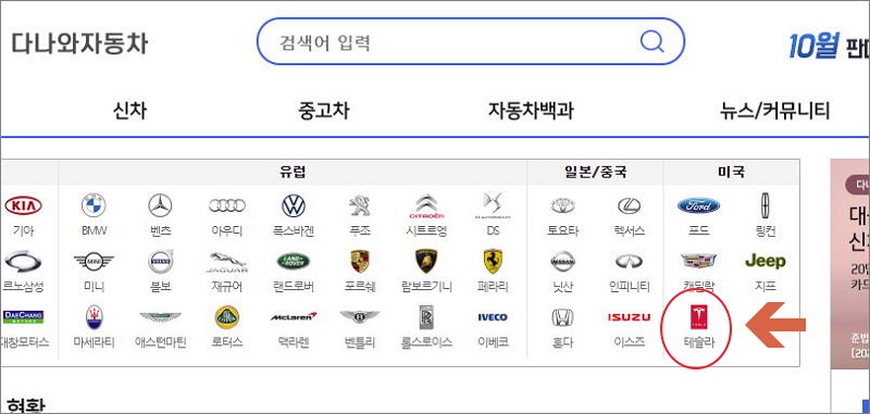 ▼ 이곳에서는 테슬라 외에 캐딜락, 지프, 링컨, 포드, 렉서스, 토요타 등 여러 브랜드의 차량 가격을 알아볼 수 있습니다. 이번 시간에는 테슬라 전기차에 대해서 집중적으로 알아보도록 하겠습니다. 메인화면에서 테슬라 브랜드 로고를 클릭하면 됩니다.