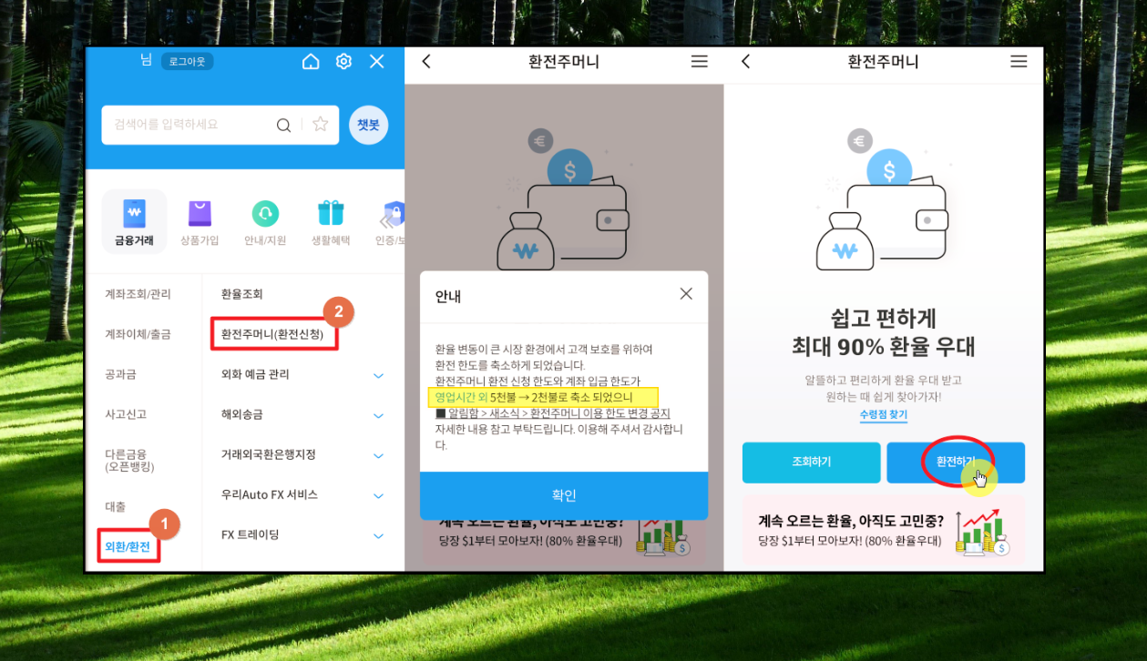 일단 안내 사항을 살펴보겠습니다. 최근에 해당 서비스에서 변경 사항이 있다고 하는데요. 영업 외 시간에서는 환전 주머니 환전신청 한도와 계좌 입금 한도가 2000불로 축소 되었다고 합니다. 영업시간 내에는 변경 사항이 없는 것으로 보아 큰 문제는 아니라고 판단됩니다. 그럼 매매를 위해 한전 주머니 페이지가 열리면 [환전하기] 버튼을 눌러 주세요.
