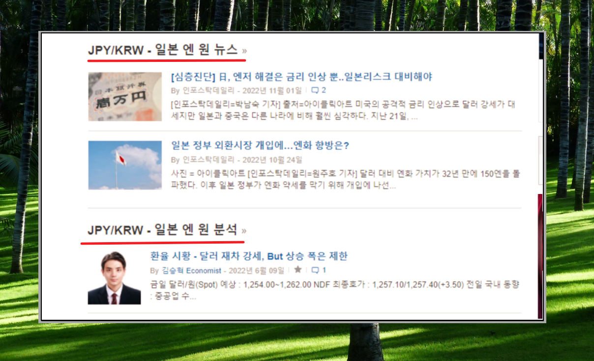 차트 다음에는 뉴스 분석 자료입니다. 일본의 외환시장에 대한 기사가 눈에 띄네요. 분석 자료도 꼼꼼히 읽어 보면 투자를 함에 있어서 도움이 될 겁니다.