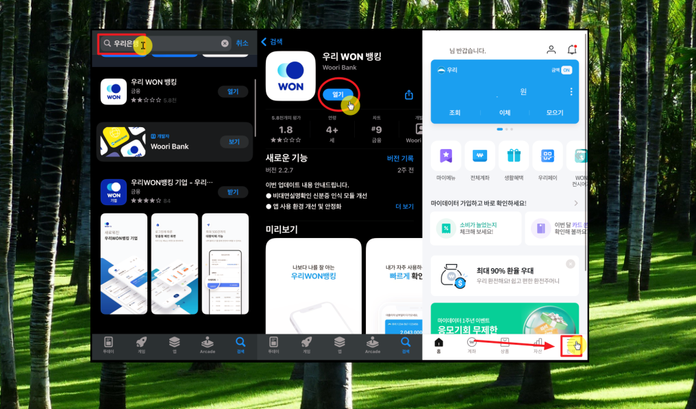 일단 매매를 위해 스마트폰에서 우리 WON뱅킹을 설치해 주세요. 제가 직접 경험한 바에 의하면 우리은행에서 제공하는 환율 우대 서비스를 이용하는 것이 수수료 면에서 가장 좋습니다. 우리 WON뱅킹 앱을 실행한 후 우측 하단에 있는 전체 메뉴 버튼을 클릭해주세요.