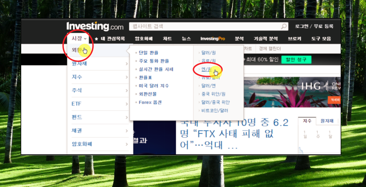 인베스트 사이트에 접속했습니다. 메뉴에서 [시장] [외환] [엔/원] 메뉴를 차례대로 클릭해주세요.