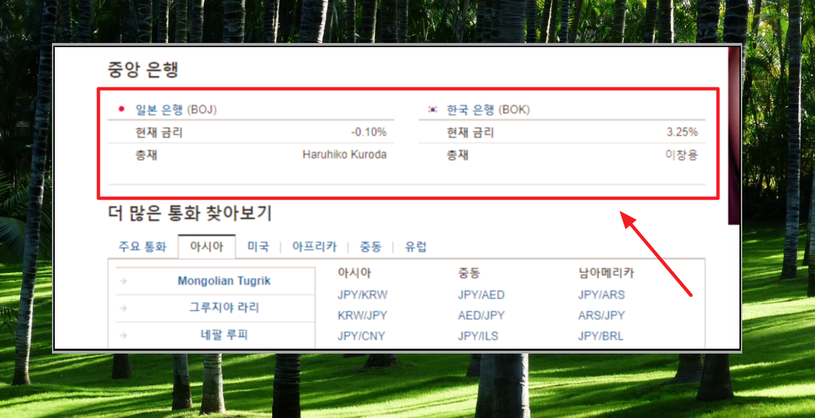 마지막으로 환율에 큰 영향을 주는 금리 정보도 확인할 수 있습니다. 현재 우리나라의 금리에 비하여 일본의 금리는 매우 낮은 편입니다.