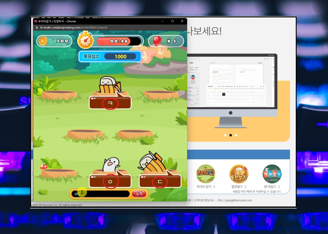 두더지 잡기 게임을 바로 시작해 보았는데요. 아기자기한 그림과 스피디한 게임성이 돋보이는 작품이에요. 즐겁게 게임하기 정말 좋아요. 즐기면서 타자 실력을 올릴 수 있죠.