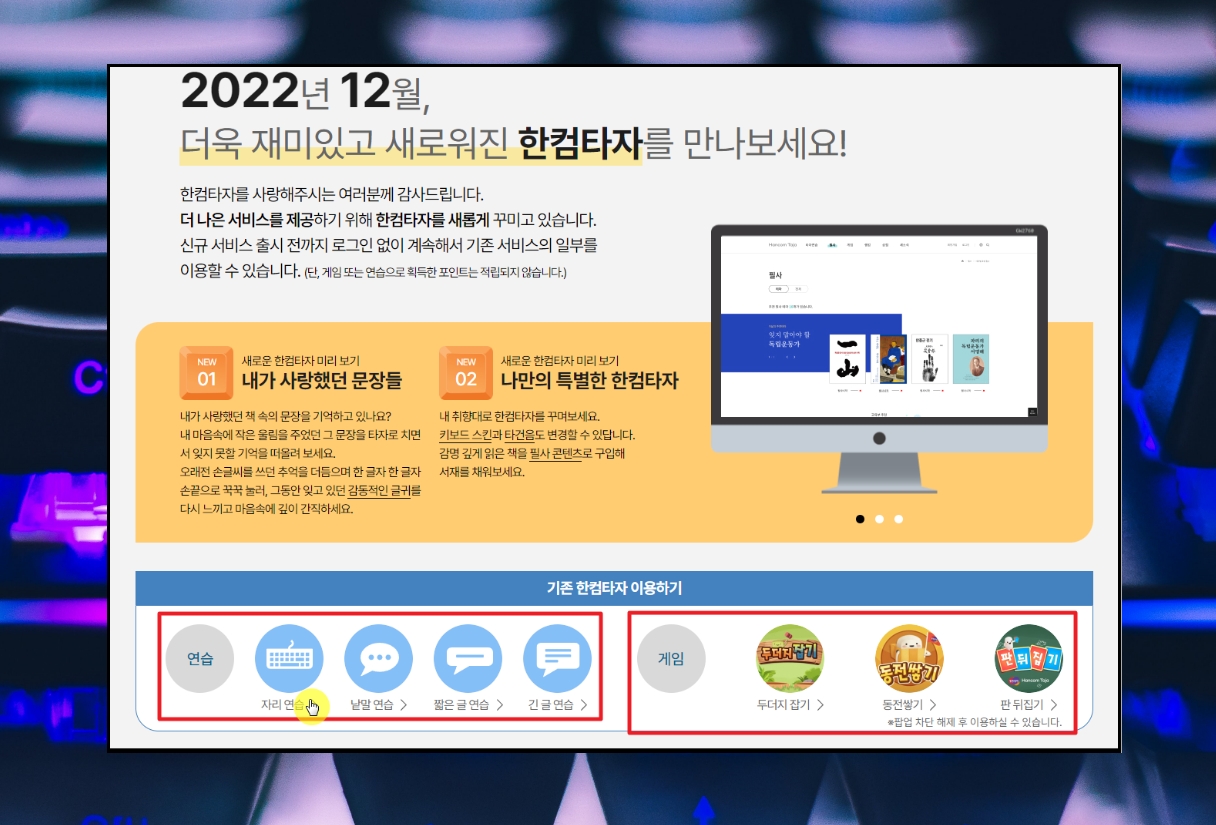해당 사이트에 오랜만에 접속해 보니 좋은 소식이 하나 있네요. 2022년 12월에 새로운 한컴타자 프로그램을 만나볼 수 있다고 합니다. 그 전까지는 기존에 제공하던 프로그램을 사용하면 되는데요. 화면 하단에 있는 [기존 한컴타자 이용하기] 목록에 있는 버튼을 클릭하면 됩니다. 타자연습을 할 수 있는 무료 서비스 4가지와 관련 게임 3가지가 마련되어 있어요.
