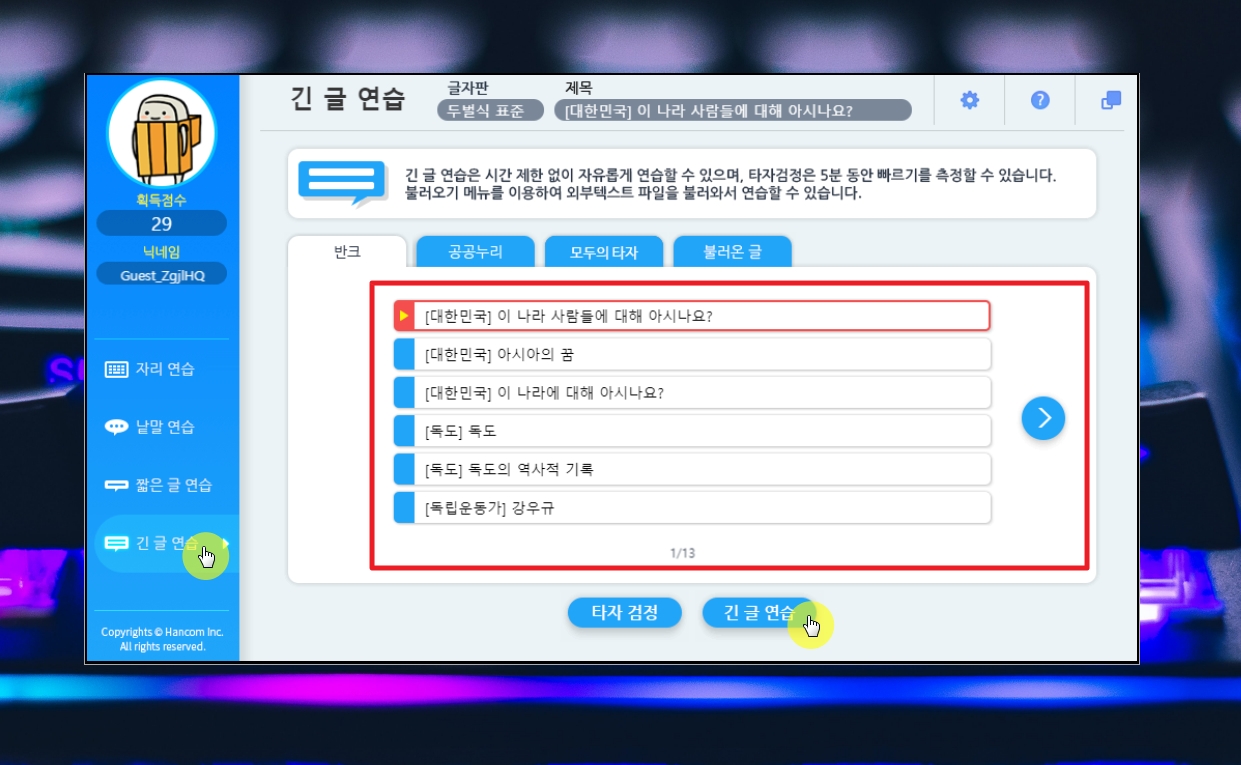 마지막으로 긴 글 연습을 진행을 진행하면 컴퓨터 키보드를 자유자재로 사용할 수 있는 수준이 됩니다.