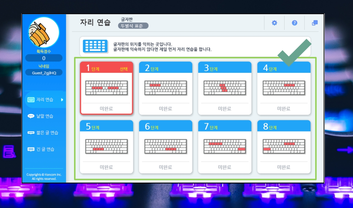 이번 시간에 우리가 사용할 프로그램은 다음과 같이 여러 단계의 자판연습 프로그램을 제공하고 있습니다. 기본자리, 검지글쇠, 오른손윗글쇠, 왼손윗글쇠, 왼손밑글쇠, 윗글쇠 나머지 등이 있죠. 연습 이력이 남기 때문에 단계별로 내가 얼마큼 연습을 했는지 표시를 해줍니다.
