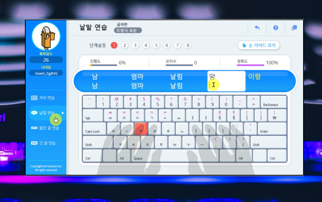충분히 자판연습을 진행했다면 바로 [낱말 연습] 단계로 넘어가는 것이 좋습니다. 글쇠를 하나씩 입력하는 것보다 낱말 입력하는 것이 더 재미 있어요.