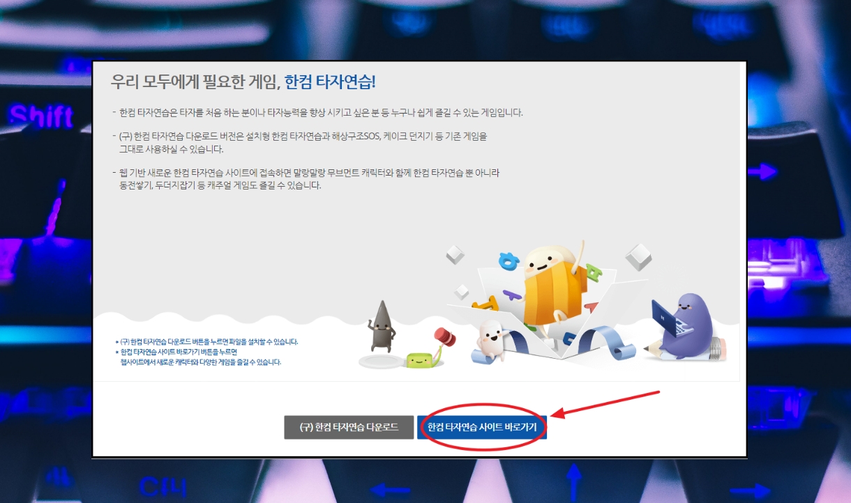 한글과 컴퓨터에서 제공하는 프로그램은 2가지 종류가 있습니다. 구 버전의 경우에는 프로그램을 설치하는 것이고요. 신 버전이라고 할 수 있는 "한컴 타자연습 사이트"는 프로그램 설치 없이 자판을 충분히 익힐 수 있습니다. 새롭게 열린 페이지에서 [한컴 타자연습 사이트 바로가기] 버튼을 클릭해 주세요.