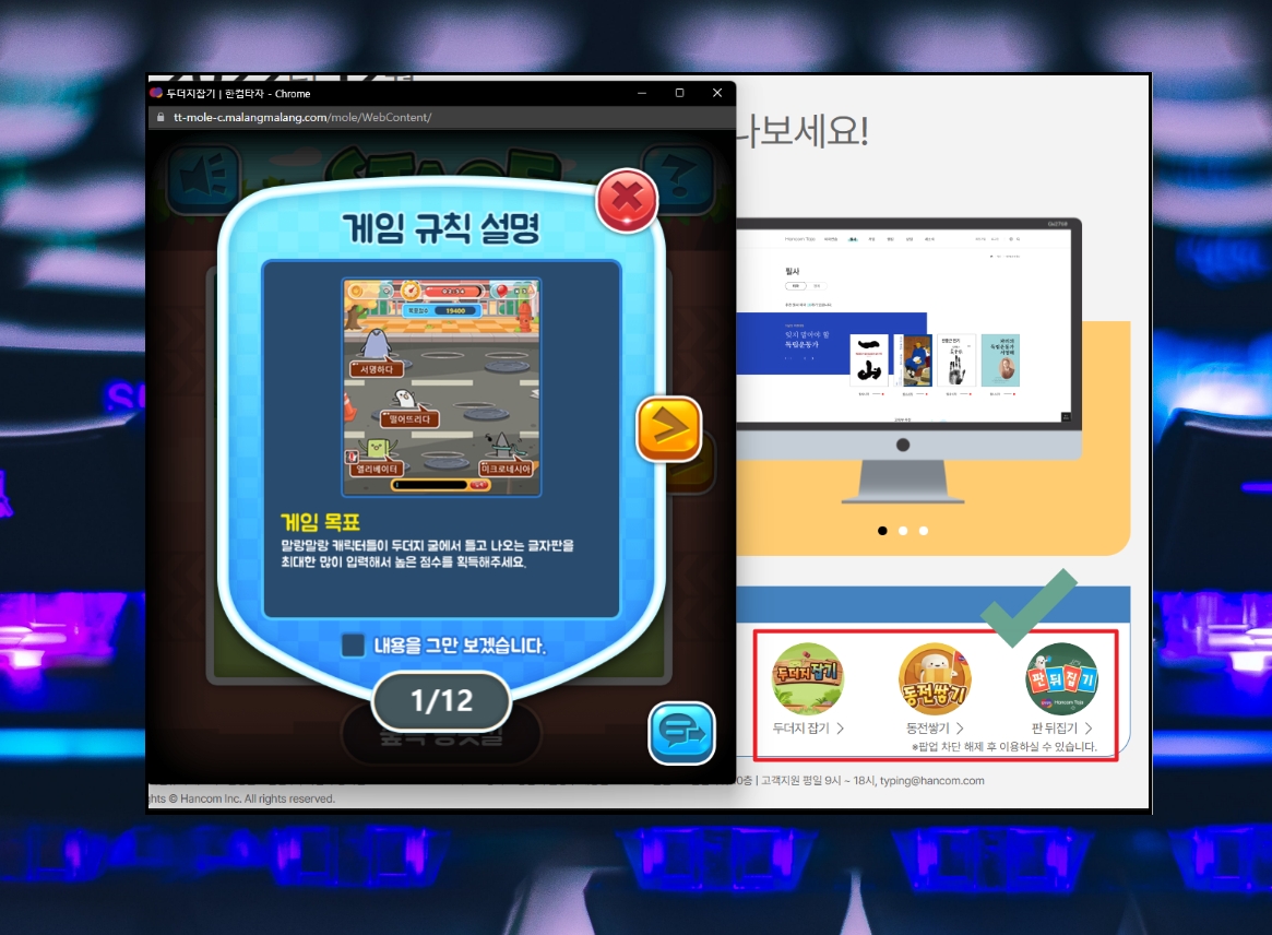 컴퓨터 자판을 익히는 것이 처음에는 재미있지만, 나중에는 조금 지겨울 수 있습니다. 이러한 경우에는 컴퓨터 키보드 자판을 쉽게 익힐 수 있는 게임을 해보세요. 한글과 컴퓨터에서는 두저지 잡기, 동전 쌓기, 판 뒤집기 이렇게 3가지 게임을 제공하고 있어요. 모두 무료에요.