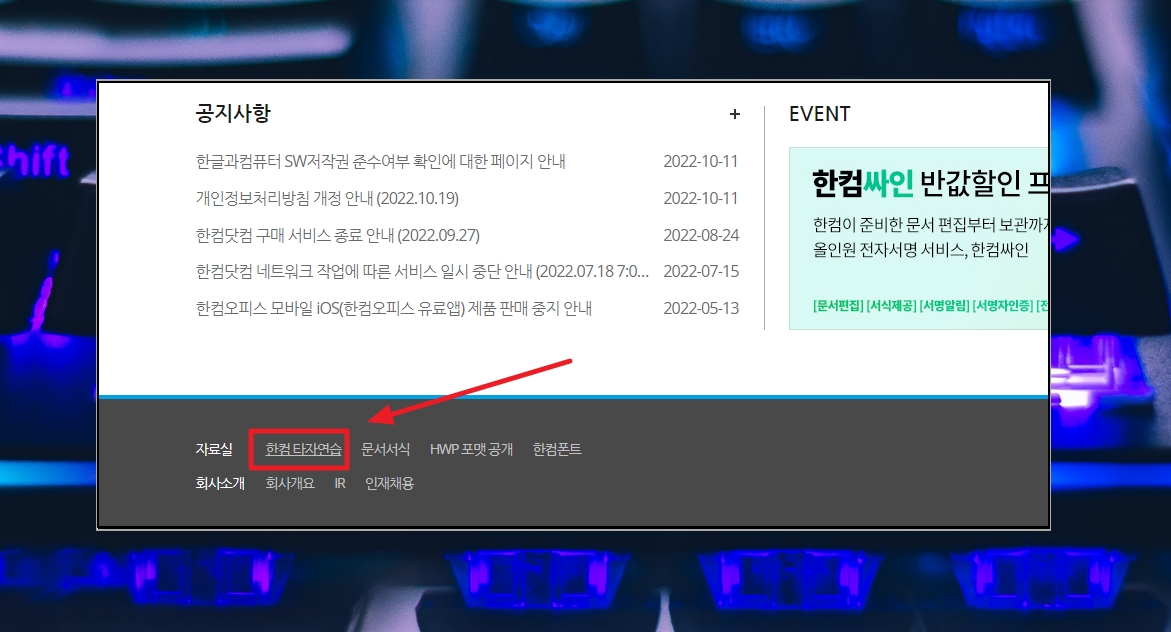 한글과 컴퓨터 사이트에 접속하면 화면에서 좌측 하단을 살펴보아주세요. 그럼 자료실 카테고리가 나타나는데요. 여기에서 [한컴 타자연습]을 클릭하면 됩니다.