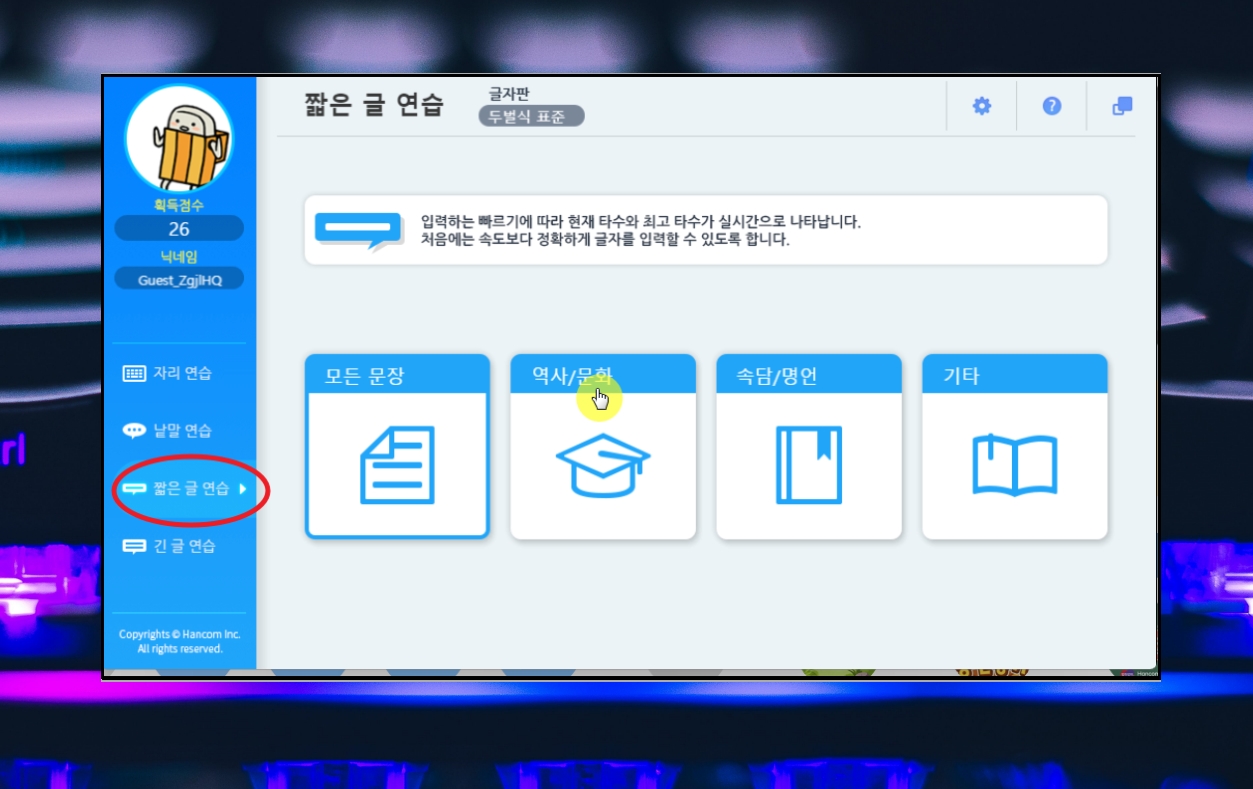 낱말을 가지고 충분히 자판을 익혔다면 [짧은 글 연습] 단계에 도전해 보세요. 역사, 문화, 속담, 명언 등을 소재로 연습을 해볼 수 있어요.