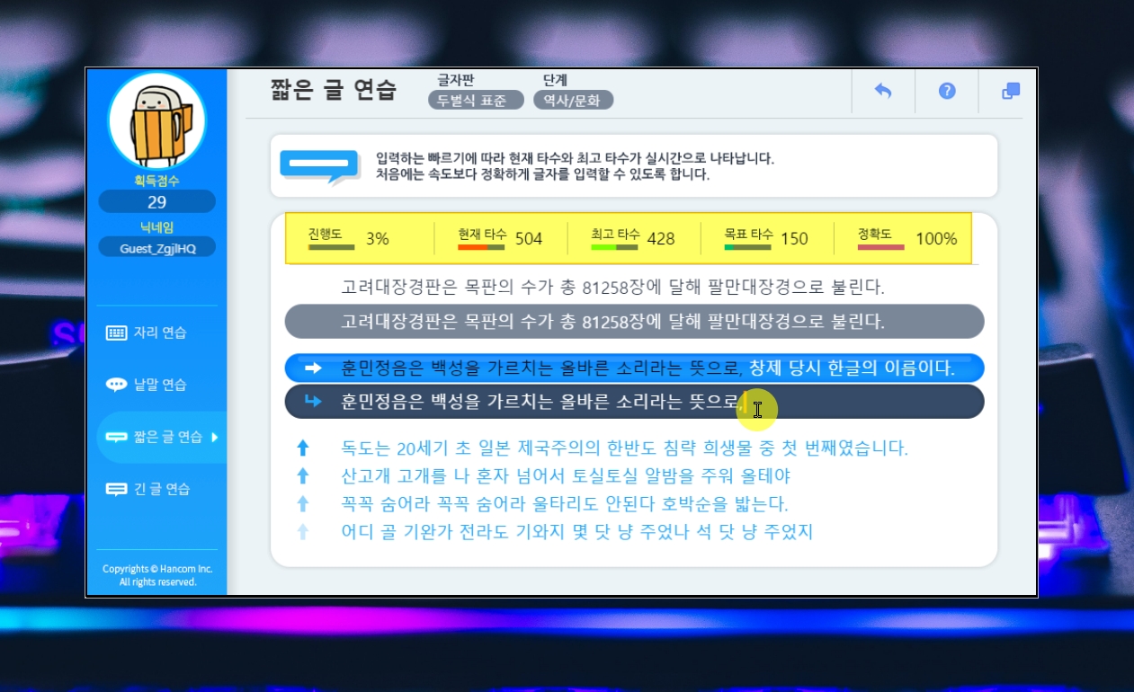 낱말을 가지고 충분히 자판을 익혔다면 [짧은 글 연습] 단계에 도전해 보세요. 역사, 문화, 속담, 명언 등을 소재로 연습을 해볼 수 있어요.