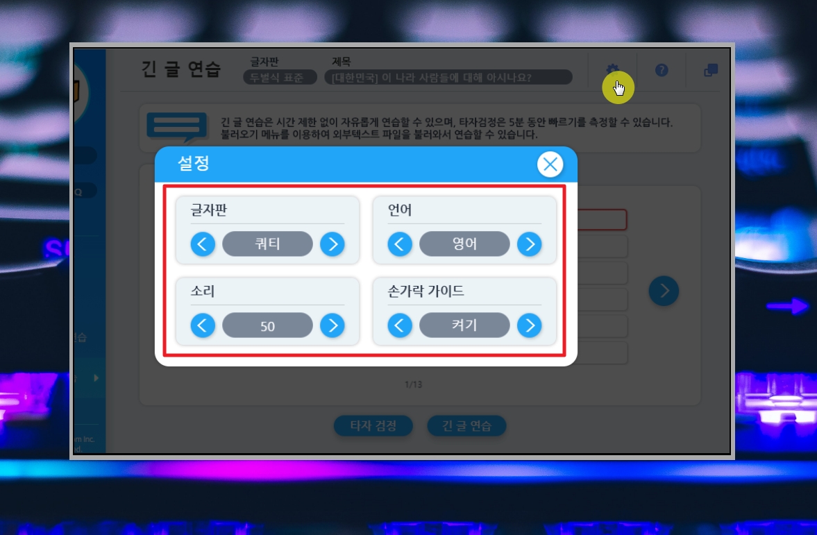 프로그램 화면에서 보면 우측 상단에 톱니 바퀴 모양의 버튼이 있는데요. 해당 버튼을 누르면 글자판, 언어, 소리, 손가락 가이드에 대한 설정을 할 수 있어요. 글자판을 선택하면 국내에서 많이 사용되는 두벌식 자판에서 세벌식 자판으로 변경이 가능해요. 언어의 경우에는 한글 뿐문 아니라 영어 연습을 할 수 있도록 변경이 가능합니다.