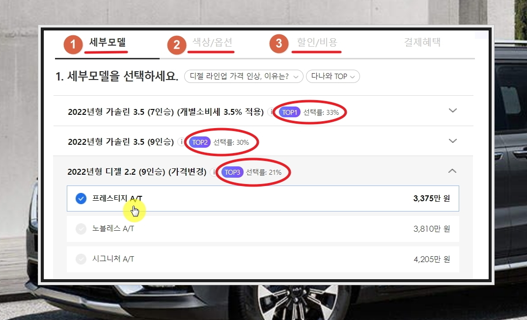 6. 이제부터 본격적으로 9인승 차량의 최종 금액을 산출해 보겠습니다. 세부모델, 색상, 옵션, 판매조건에 대하여 본인에게 해당하는 조건만 클릭하면 자동으로 계산되는 가격표를 통해 최종 금액 확인을 할 수 있습니다. 가장 먼저 세부모델 입니다. 앞서 확인했던 상세한 사양과 함께 인기 순위(TOP 표시 되어 있음)를 참고하여 마음에 드는 것을 선택해 주세요. 가격표를 보면 각 트림마다 400만원에서 500만원 정도의 차이가 나고 있음을 알 수 있습니다.