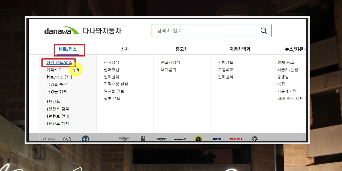 3. 다나와 자동차 홈페이지에 접속하면 렌트, 리스, 신차, 중고차 이렇게 4가지 차량 이용 방식이 있습니다. 여기에서 [장기 렌트/리스]를 선택합니다.