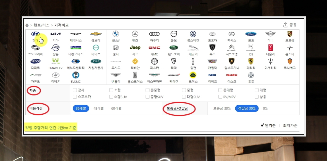 4. 새롭게 열린 페이지를 보면 여러 가지 조건을 선택할 수 있도록 되어 있는데요. 여기에서 본인이 이용하고자 하는 장기렌트카에 관한 조건을 지정하면 됩니다. 그럼 그에 맞는 차량 모델과 이용 금액이 나타납니다. 브랜드, 차종, 사용기간, 보증금 및 선납금 여부를 차례대로 선택해 주세요.