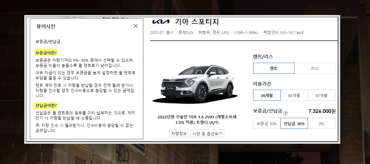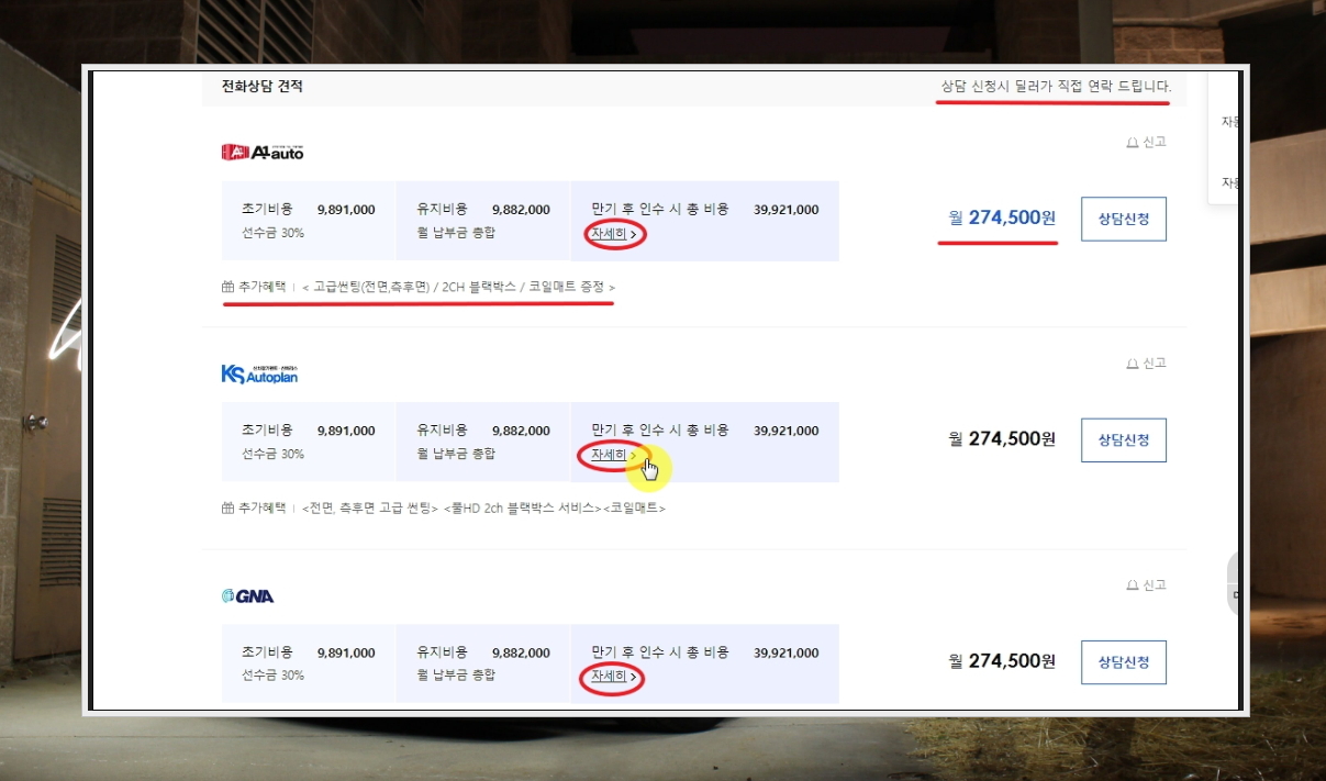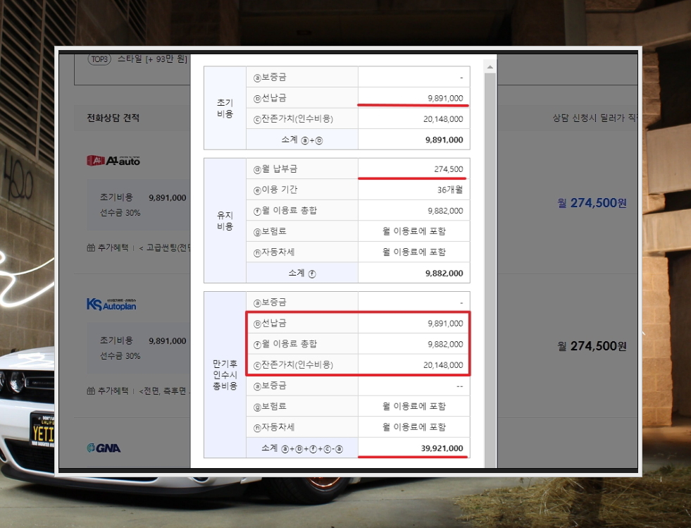 8. [자세히] 버튼을 누르면 다음과 같이 초기비용, 유지비용, 만기후 인수시 총비용이 구체적으로 기재되어 있는 표가 나타납니다. 나중에 계약이 끝나고 인수하고자 할 때 비용을 얼마나 지불하면 되는지 알고 싶을 때 유용합니다.