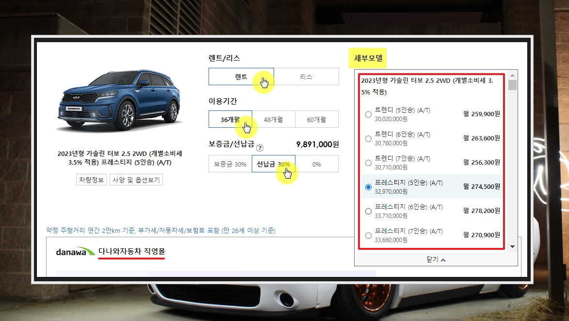 6. 저는 기아 쏘렌토를 장기간 이용하는 상품을 선택했습니다. 추가적으로 세부모델에 따라 월 비용이 얼마나 하는지 알 수 있는 가격표가 나타나는데요. 아무래도 높은 등급의 세부모델을 선택할수록 월 이용료가 비싸질 수 밖에 없습니다.