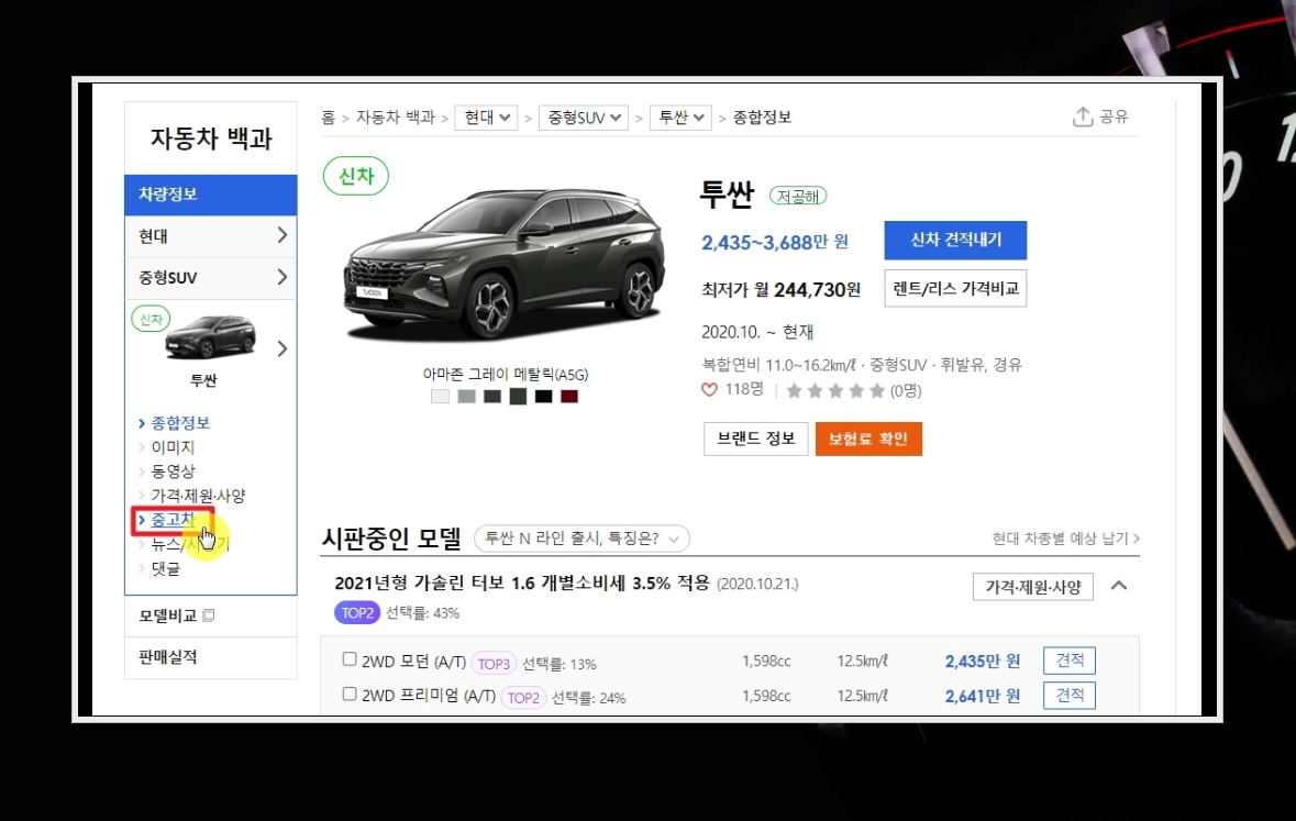 2. 제가 투싼 중고차 가격을 제대로 알아볼 때에는 다나와 자동차 사이트를 이용합니다. 시세 파악이 용이하도록 매물이 많고, 정리가 잘 되어 있기 때문입니다. 신차 가격도 알아보기에 정말 좋아요.
