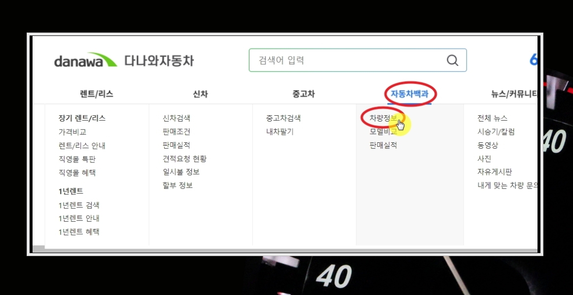 3. 다나와 자동차 사이트에 접속했습니다. 현대 투싼에 대해 집중적으로 알아보려면 메뉴에서 자동차백과 카테고리에 있는 [차량정보]를 선택하면 됩니다.