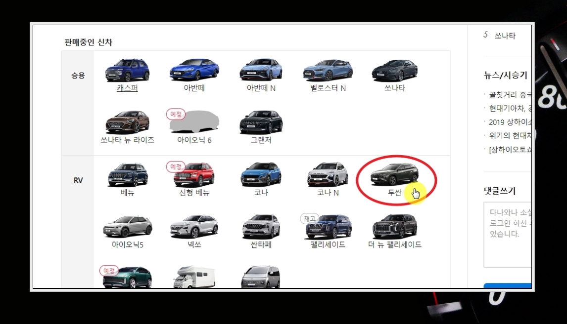 5. 현대자동차에서 현재 판매 중인 신차 모델이 주르륵 나왔습니다. 캐스퍼, 아반떼, 코나, 베뉴, 넥쏘, 투싼 등 다양합니다. 여기에서 확인하려고 하는 챠랑 모델을 선택해 주세요.