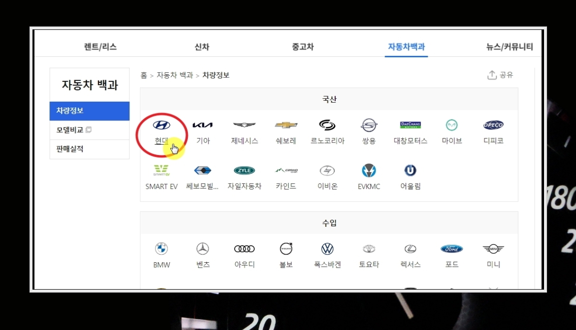 4. 차량 정보에서 투싼을 찾아보도록 하겠습니다. 국산과 수입 브랜드가 여러 개 나오는데, 여기에서 [현대]를 선택합니다. 참고로 다른 브랜드의 중고차 가격을 알아보고 싶은 때에도 이 방법이 유효합니다.