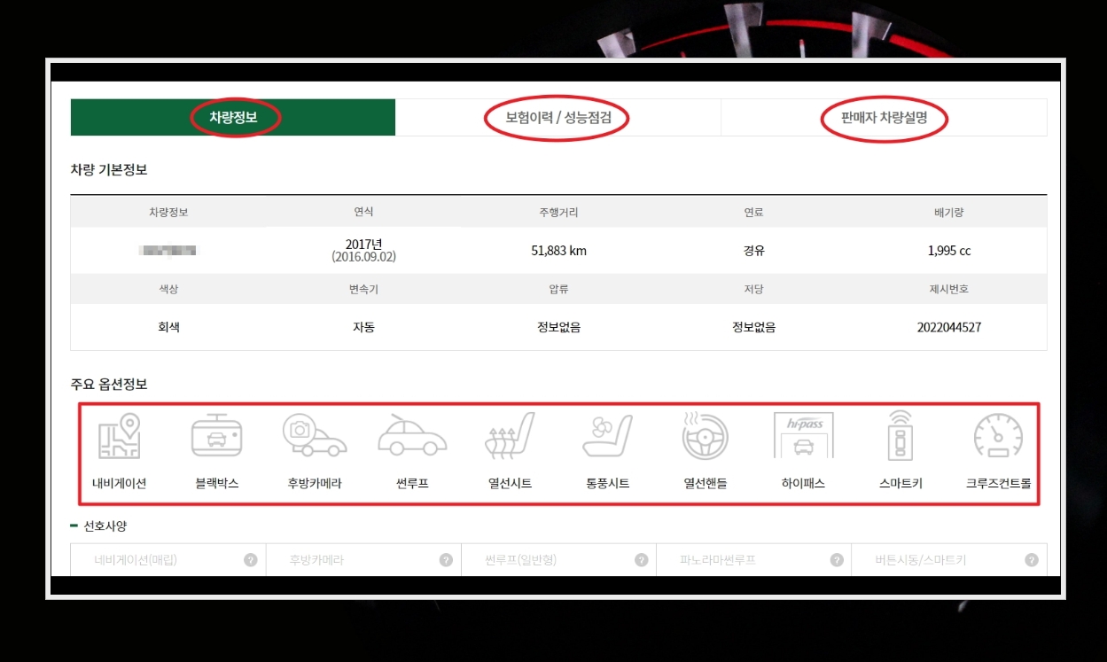 10. 사진 다음으로는 우리가 선택한 중고차에 대한 상세 정보를 확인할 수 있습니다. 연식, 주행거리, 연료 타입, 배기량, 색상, 변속기 등의 기본정보는 물론이고, 옵션이나 성능에 대한 내용도 살펴볼 수 있죠. 옵션의 경우에는 차량 구매 후 변경을 하지 못하니 본인에게 필요한 것이 무엇인지 꼼꼼하게 살펴보셔야 합니다.