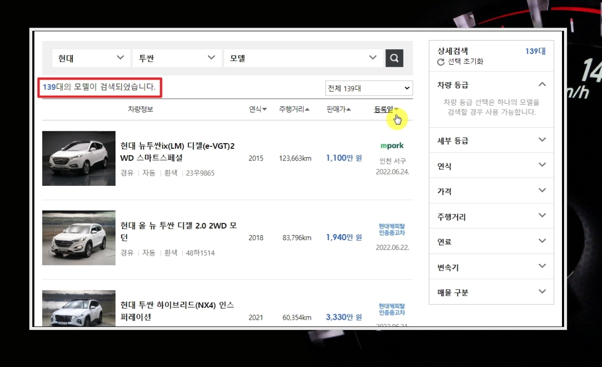 7. 제가 앞에서 언급한 바와 같이 139대의 투싼 중고차 가 나왔습니다. 이것은 현재 기준이고, 시간이 좀 흐르면 더 많은 매물로 바뀌어 있을 것입니다. 리스트를 살펴볼 때에는 [등록일] 기준으로 정렬을 하는 것이 좋습니다. 최근에 올라온 것을 먼저 검토해 볼 수 있기 때문이죠.
