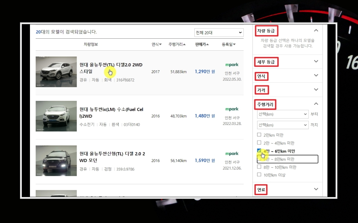 자신이 원하는 조건으로 설정한 후 그 조건을 충족한 매물끼리 비교해 볼 수 있죠. 제 경우에는 주행거리가 적당한 것을 좋아합니다. 주행거리가 4만에서 6만km 사이인 것을 검색한 후, 이중에서 가격이 저렴한 것을 선택해 보았습니다.