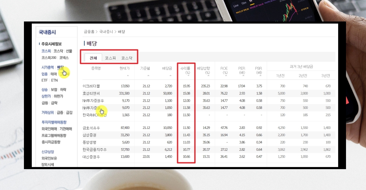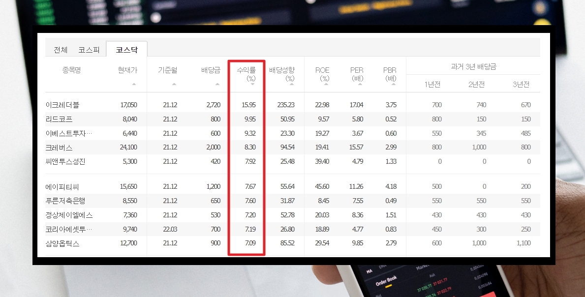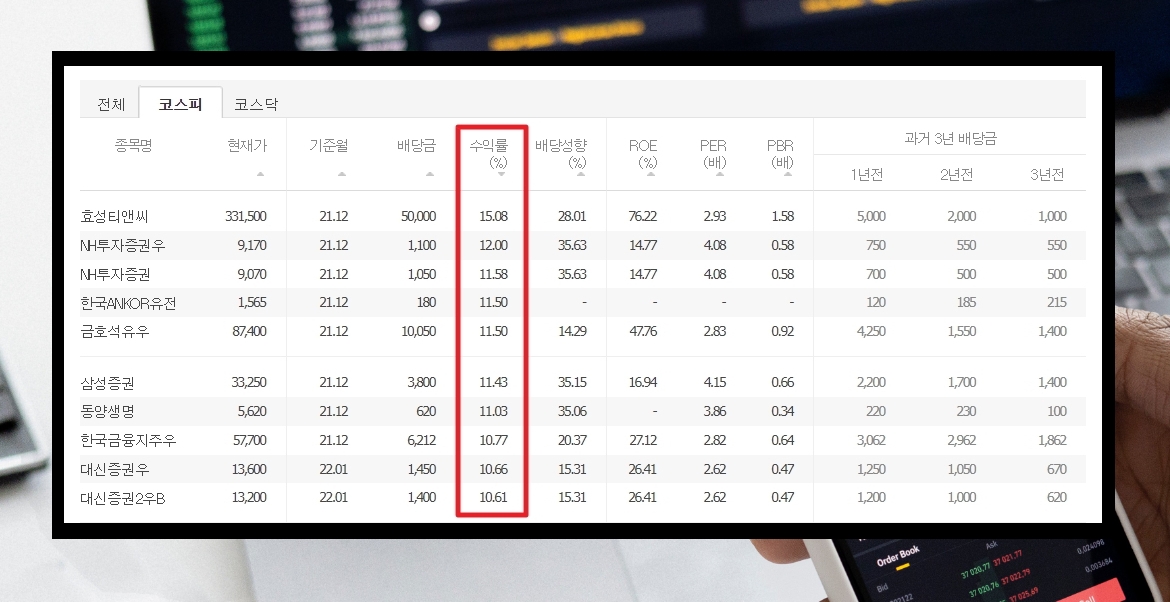 리스트에 나와 있는 금액, 성향, ROE, PER, PBR 등 모든 요소를 두루두루 확인해 보는 것이 좋죠. 또 한 가지 최근에 해당 주식이 많이 하락하지는 않았는지 꼭 확인해 보세요. 변동성이 적고, 꾸준이 이익이 상승하는 기업을 선택하는 것이 좋습니다.