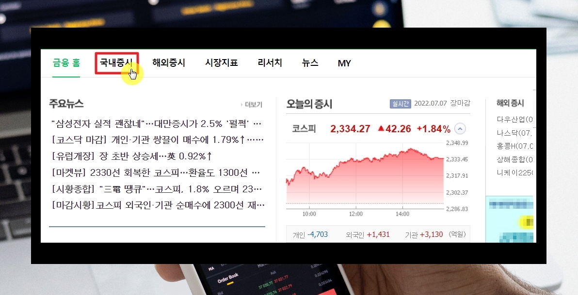 4. 네이버 증권 사이트에 접속했습니다. 국내 및 해외 증시에 대한 정보가 풍부한 곳이죠. 해당 사이트에 접속하면 가장 먼저 코스피와 코스닥 지수를 확인하는 것이 좋습니다. 지금 주식에 투자를 하는 것이 좋은지 아닌지 판단하기 위해 참고하기 좋은 지표이기 때문입니다. 그럼 배당률 높은 종목에 대한 정보를 얻기 위해 메뉴에서 [국내증시]를 선택해 주세요.