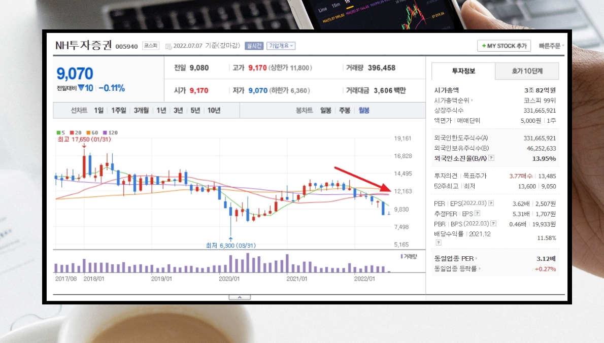 6. 저는 증권주 하나를 선택해보았습니다. 제가 이것을 선택한 이유는 배당률이 생각보다 높은 수준이었기 때문입니다. 그래서 시세를 확인해 보니 최근 여러 달 동안 지속적으로 하락하고 있었습니다. 이렇게 되면 이전에 지급된 배당금 대비 현재가가 낮아지기 때문에 해당 수치가 높을 수 밖에 없습니다.