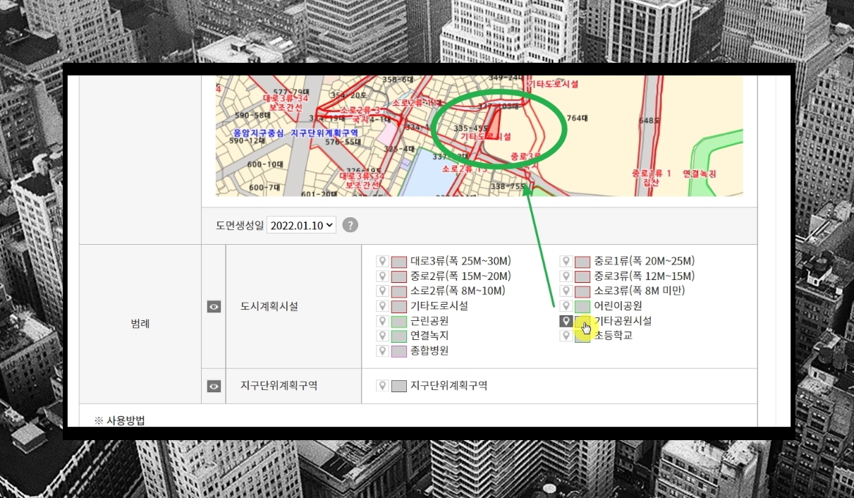 6. 해당 지도를 가지고 어떤 시설이 있는지 파악하기 어려울 수 있습니다. 이럴 떄에는 범례 부분을 이용하면 됩니다. 시설 중 하나를 마우스로 클릭하면 해당 시설에 대한 위치가 지도에 표시 됩니다. 시설의 종류로는 도로, 근린공원, 연결녹지, 종합병원, 어린이공원, 기타공원시설, 초등학교 등 다양합니다.