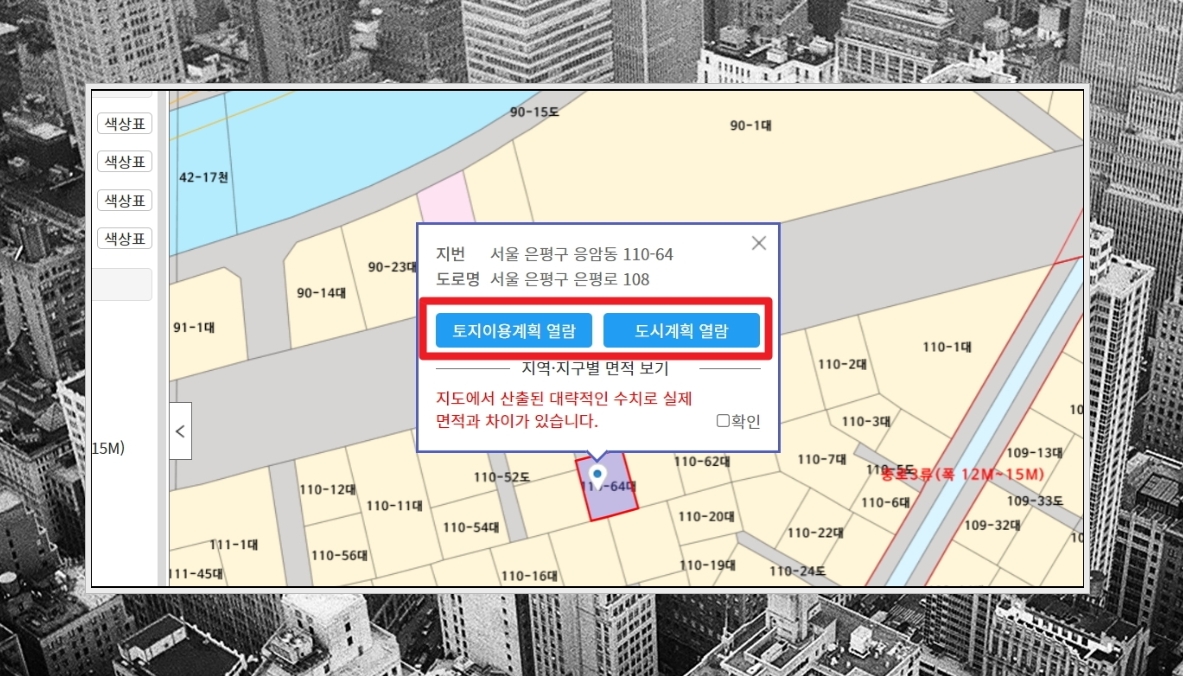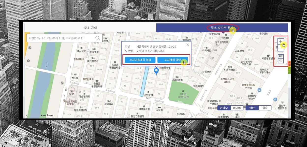 4. 지도로 주소를 찾는 방법은 정말 쉽습니다. 지도 화면에서 원하는 지역을 마우스로 드래그하여 찾습니다. 그 다음 화면을 최대한 확대하고, 확대한 상태에서 확인원 열람을 하고 싶은 지역을 마우스로 클릭합니다. 그럼 다음과 같이 [토지이용계획 열람]과 [도시계획 열람] 버튼을 선택할 수 있는 창이 나타납니다.