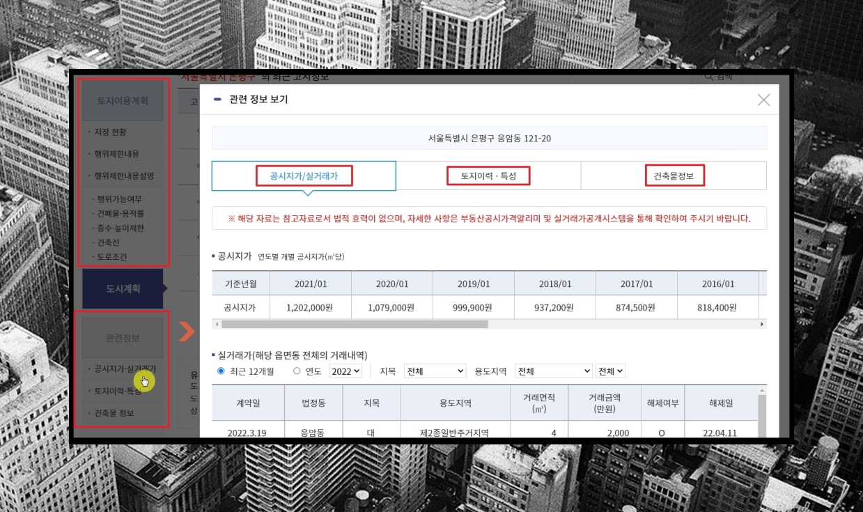 8. 해당 페이지에서 좌측을 보면 여러 메뉴가 있습니다. 토지이용계획 확인원 열람 및 관련 정보 탐색을 할 수 있도록 해주는 것입니다. 관련 정보로는 공시지가, 실거래가, 토지이력 및 특성, 건축물 정보가 있습니다.