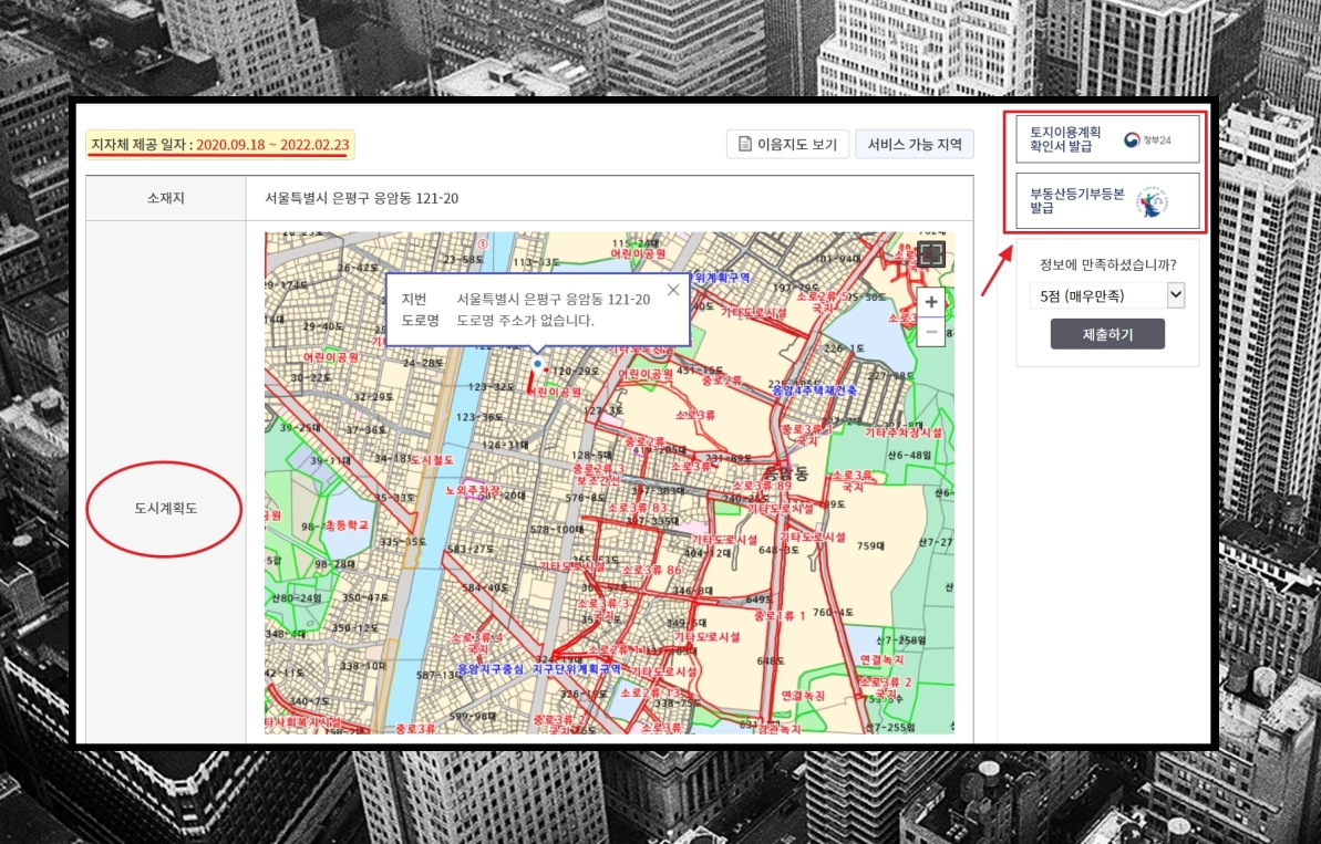 5. [도시계획 열람] 버튼을 클릭하면 도시계획도를 볼 수 있는 확인원 페이지가 열립니다. 지도를 확대하면 좀 더 뚜렷하게 내용을 확인할 수 있습니다. 화면 우측 상단을 보면 "확인서 및 부동산등기부등본 발급"을 할 수 있는 메뉴가 있습니다. 서류 발급이 필요한 경우에 사용해 보시길 바랍니다.