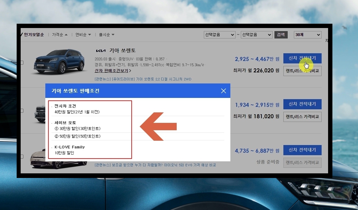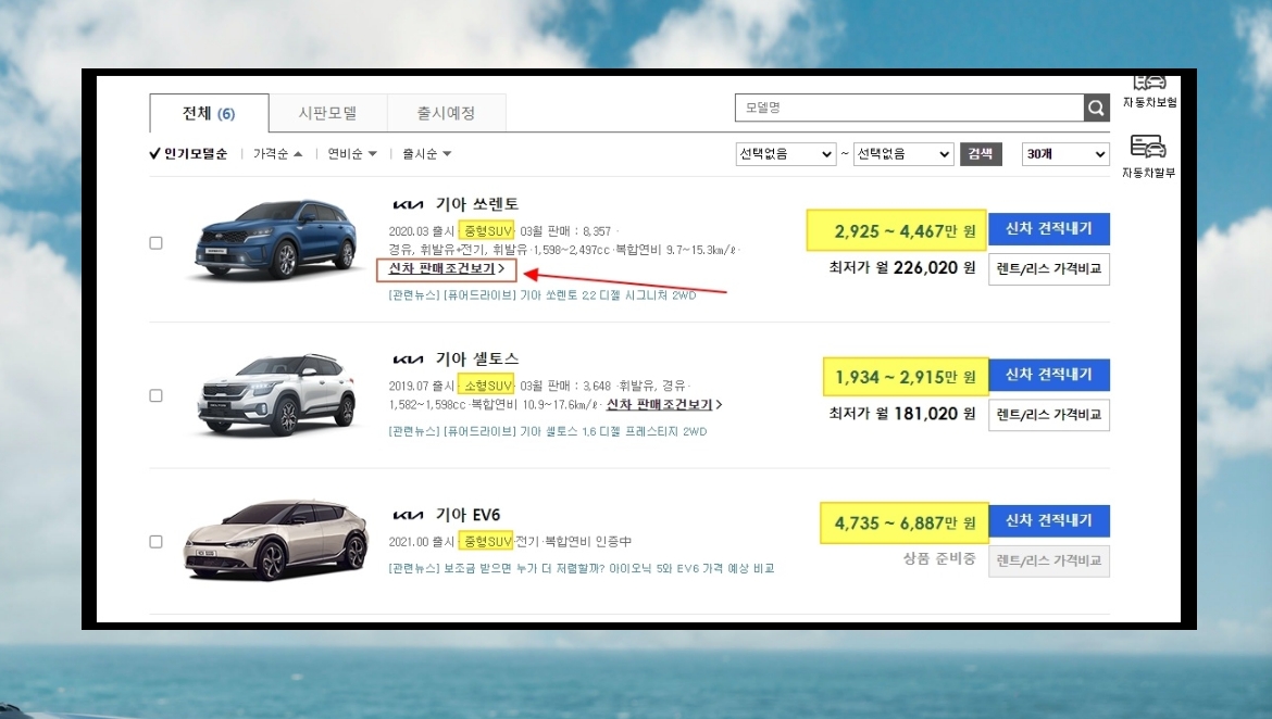 5. 검색 결과를 보면 기아 자동차 SUV 차종이 모두 나왔습니다. 인기 모델순, 금액순 등으로 정렬이 가능한데요. 요즘에는 기아에서 쏘렌토, 셀토스, EV6의 인기가 높네요.