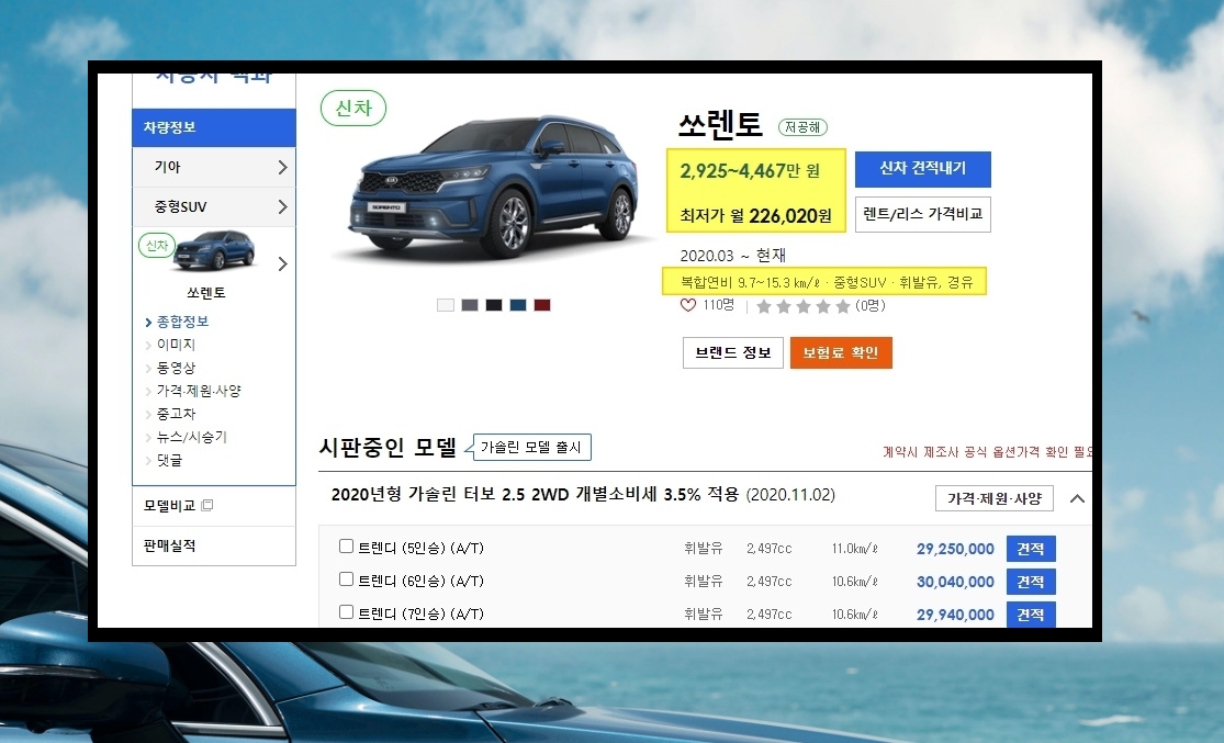 1. 간단하게 기아에서 만드는 모델 중 하나인 쏘렌토를 살펴보았습니다. 가격표를 보면 2,925만원에서 4,467만원으로 되어 있는데요. 이렇게 되어 있는 것은 세부모델이나 옵션, 이용할 수 있는 판매조건에 따라 금액 차이가 많이 나기 때문입니다.