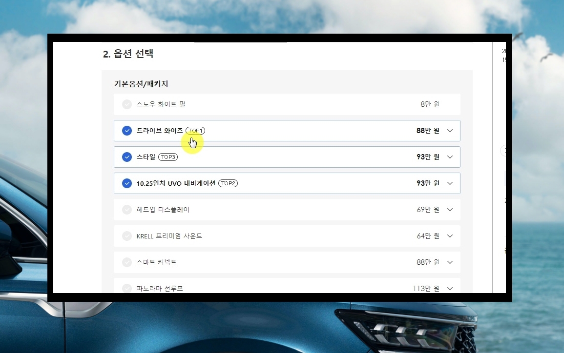 8. 이번에는 옵션을 선택할 차례입니다. 기아 자동차에서 많이 선택하는 옵션으로는 드라이브 와이즈, 스타일, 10.25인치 UVO 내비게이션 입니다. 해당 옵션이 어떤 기능을 하는지 알고 싶다면 리스트에서 우측에 위치한 화살표를 클릭하면 설명이 나옵니다.
