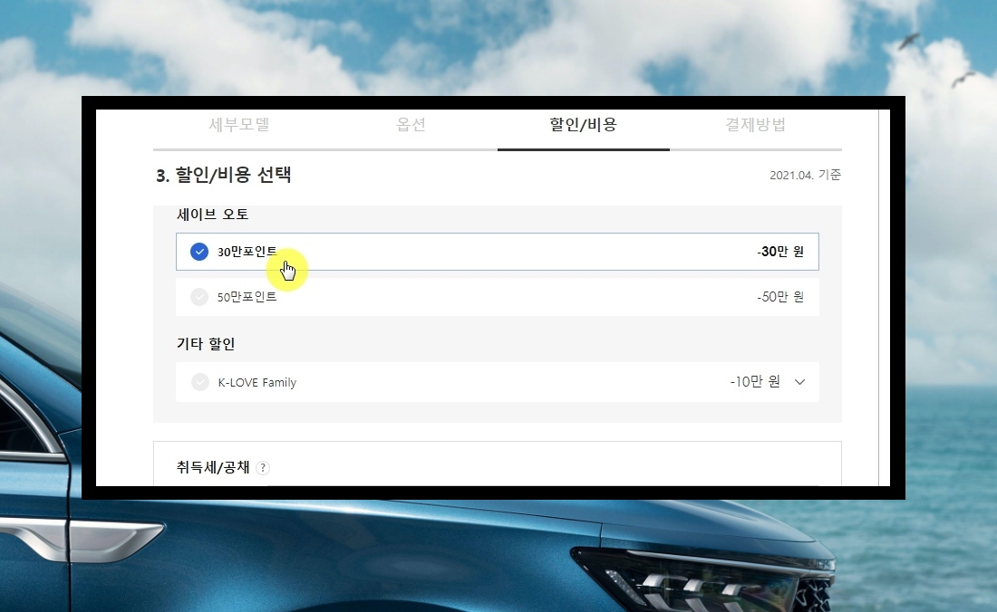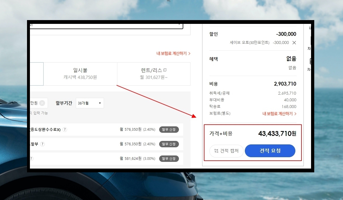 11. 모든 내용을 다 입력한 상태에서 화면 우측 아래에 있는 가격표를 보면 자동차 최종 구매 비용을 확인할 수 있습니다. 할인, 혜택, 비용, 옵션 등 우리가 선택한 것에 대하여 정리된 금액도 확인이 가능하오니 참고하시길 바랍니다.