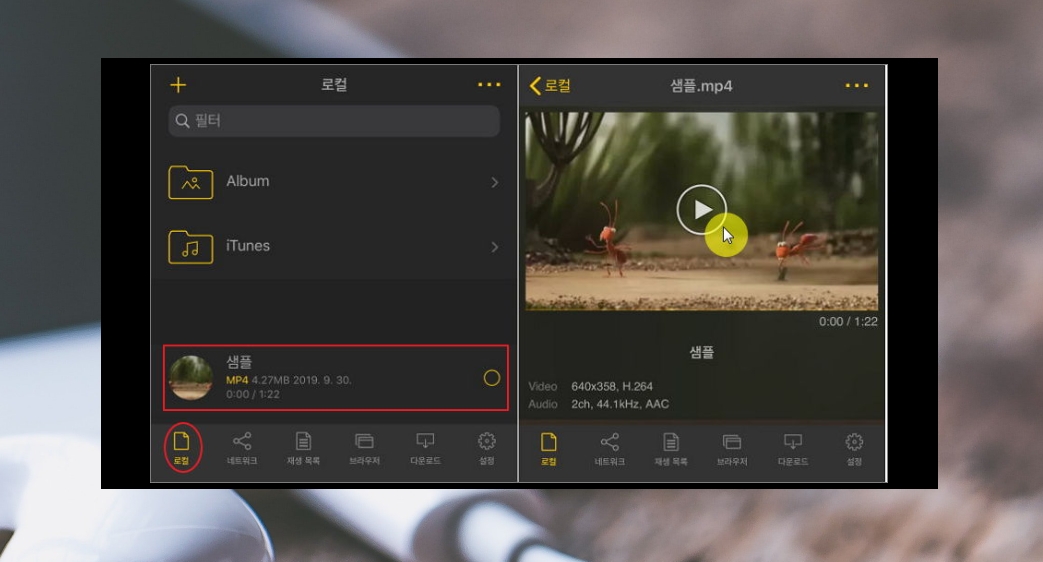8. 이제 아이폰에 넣은 파일을 재생 시켜볼 차례에요. 스마트폰을 켜고, nPlayer 앱을 실행해 주세요. 로컬, 네트워크, 재생목록, 브라우저, 다운로드, 설정 이렇게 5가지 메뉴가 있는데요. 우리가 넣은 비디오 파일은 로컬에서 찾을 수 있어요. 제가 넣은 샘플 비디오 파일이 보이네요.