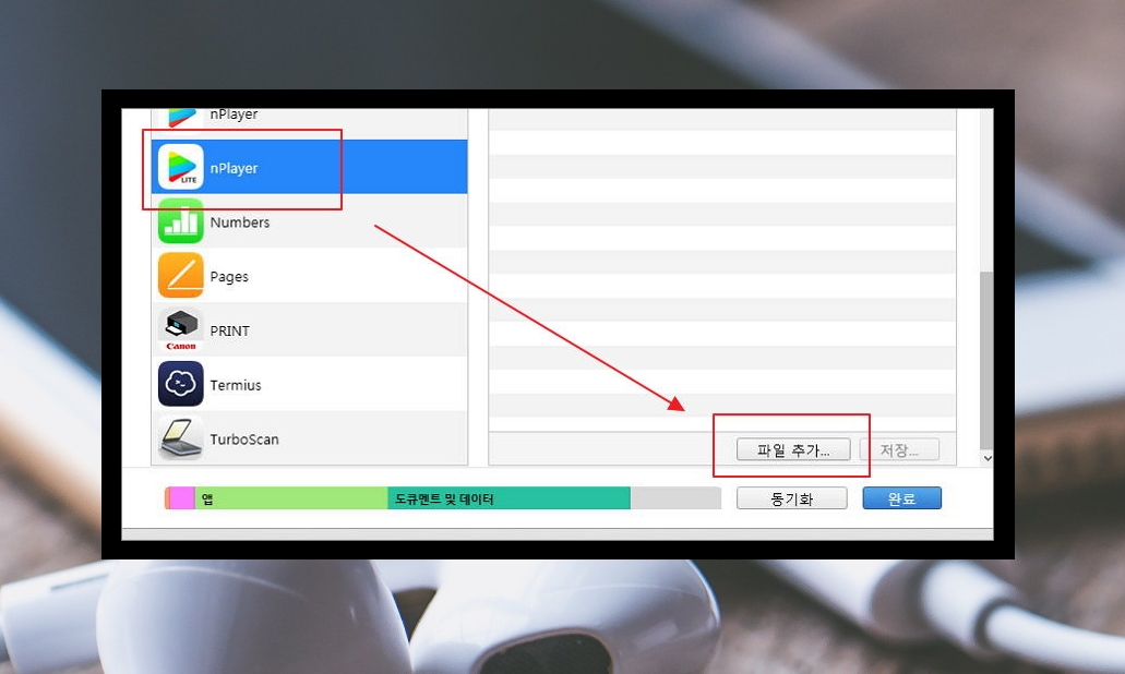7. nPlayer의 도큐멘트 영역을 보시면 우리가 넣은 아이폰 동영상을 발견할 수 있어요. 혹시 모르니 아래에 있는 [동기화] 버튼을 한 번 눌러주세요. 그 다음 [완료] 버튼을 누르면 동영상 넣기 완료에요.
