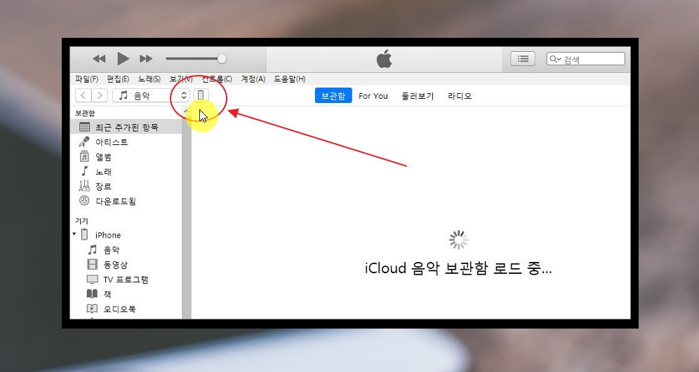 3. 이제 본격적으로 전송 작업을 진행해 볼게요. 컴퓨터와 이이폰을 케이블로 연결해주세요. 이 상태에서 컴퓨터로 아이튠즈를 실행합니다. 그럼 아이튠즈 화면에 아이폰 아이콘이 나타날 거에요. 클릭해 주세요.
