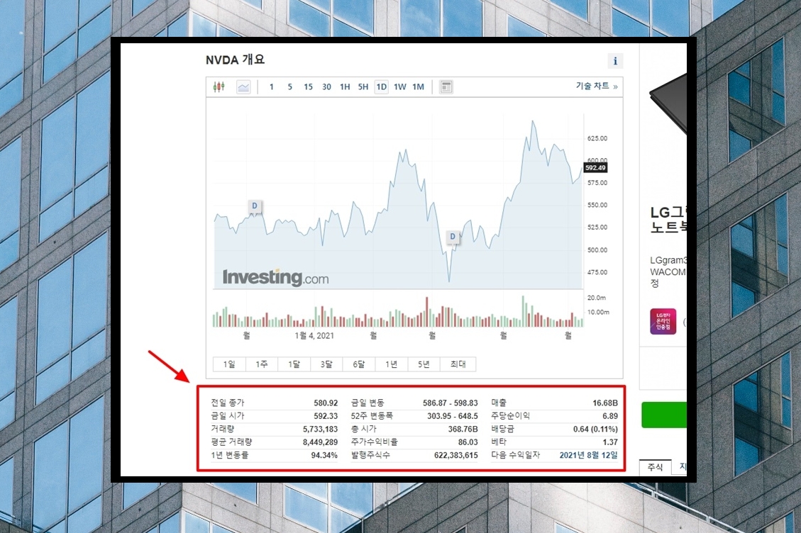 9. 실시간으로 시세가 반영되는 차트 확인도 가능한데요. 차트 아래를 보면 해당 종목에 대한 시가총액과 함께 배당금, 주당순이익, 매출 등 다양한 수치를 확인할 수 있습니다.