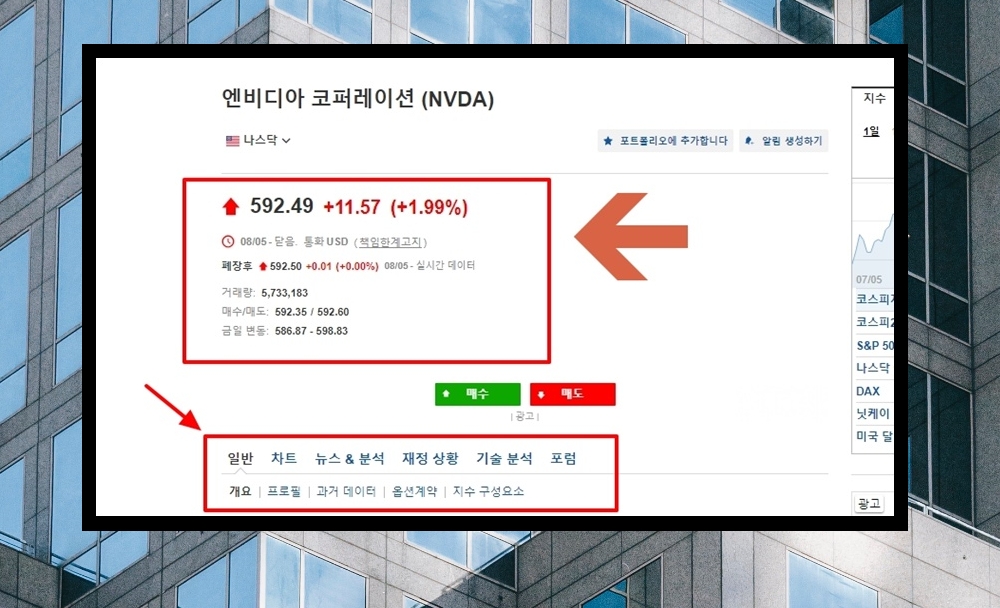 8. 순위 표에서 마음에 드는 종목을 클릭해 보세요. 그럼 해당 종목에 대한 시세는 물론이고, 차트, 뉴스, 분석 자료, 포럼이나 과거 데이터를 살펴볼 수 있습니다.