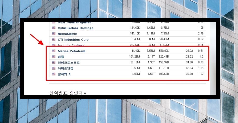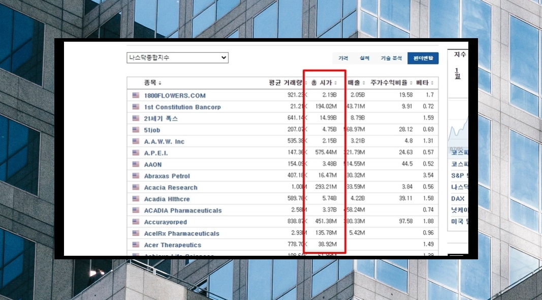 5. 각 종목에 대한 시총이 나타났습니다. 바로 "총 시가" 부분인데요. 시총은 "시가" 또는 "시가총액"이라고 말할 수 있습니다. 이 외에도 평균 거래량, 매출, 주가수익비율, 베타 확인이 가능해요. 여기에서 나스닥 시총 순위를 알아보고 싶다면 표 상단에 있는 "총 시가" 부분을 클릭하면 됩니다.