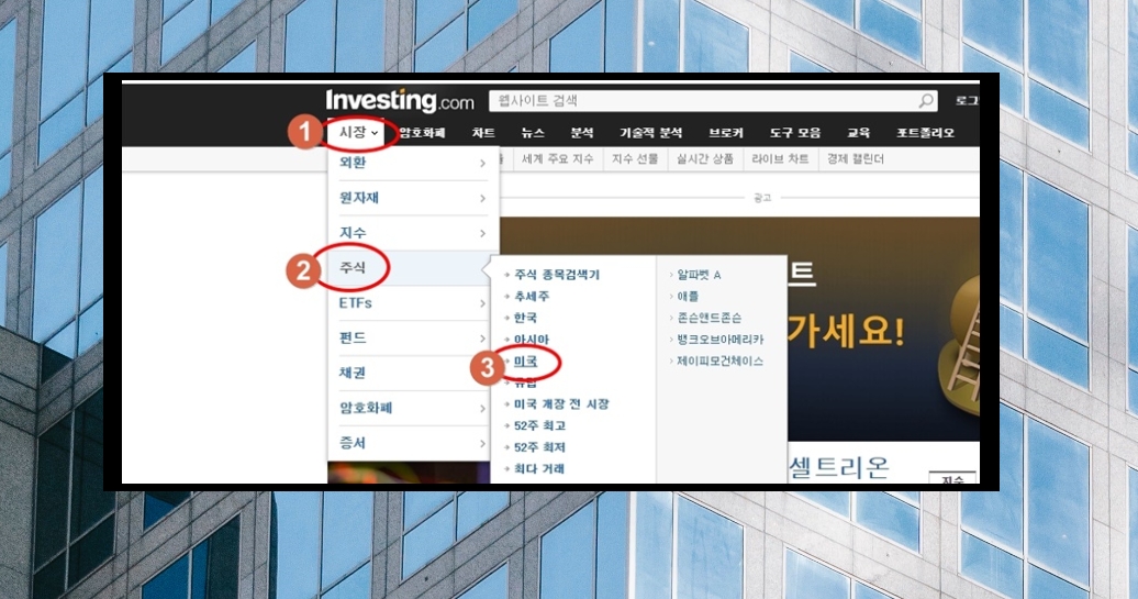 2. 인베스팅 홈페이지에서 나스닥 시총순위를 알아보려면 메뉴에서 "시장"을 선택해야 합니다. 그 다음 미국 주식을 선택하면 됩니다. 참고로 나스닥은 다우존스와 S&P와 같이 미국 지수 중 하나입니다.